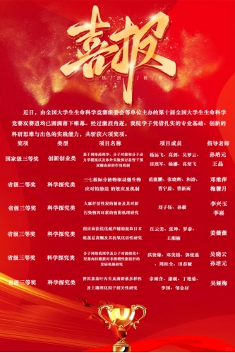 此次佳绩既是对我院学子科研实践能力的充分肯定,更彰显了学院在生命科学学科建设、实践教学改革中的显著成效。未来,学院将持续以学科竞赛为抓手,深化“以赛促学、以赛促教、以赛促创”培养模式,为国家生命科学领域培育更多高素质创新人才!
