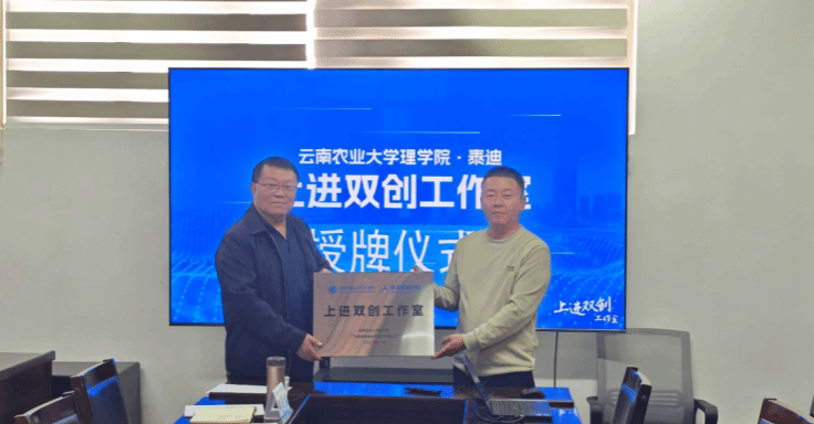 随后,在与会嘉宾的见证下陆自强院长与彭艳昆总经理共同为“云南农业大学·泰迪上进双创工作室”揭牌。