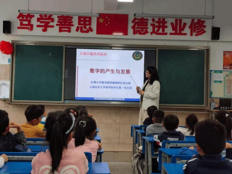 为深入学习贯彻党的教育方针,深化党建引领下的校地协同育人机制,推动理学院党委与红旗小学教育集团德润校区党支部共建方案落地,2026年4月1日,学生第一党支部在红旗小学德润校区开展“数字的产生与发展”主题科普课堂活动,以党建为纽带、以科普为载体,为小学低年级学生打造趣味化数学启蒙课堂,实现党建工作与教育教学双向赋能。